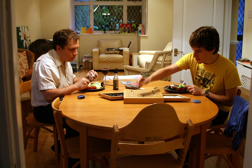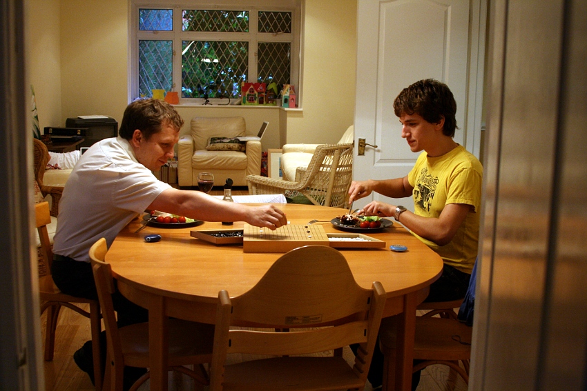 (А вместо занавесок у нас окно заросло лозой. Надо бы и обрезать, а то уже совсем ничего не видно, но мне даже жалко: скоро осень, оно все станет красным и желтым, будет красиво... А еще на столе валяются точилка и таймер - это сашкин кумоновский реквизит.)