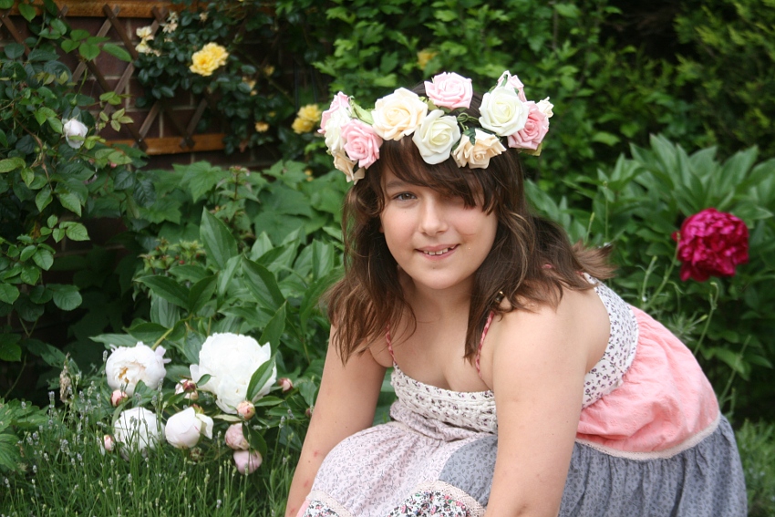 Готовим с Александрой костюм к "греческому дню" в школе, начали с венка из роз (притащили три свадебных бутоньерки, разобрали на отдельные цветки, сплели венок). Он чудесно подошел к ее любимому разлетайскому сарафану, и теперь наше дитя цветов его практически не снимает. Чертовски романтичная дева получилась.